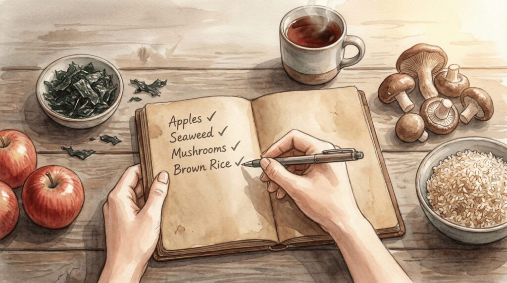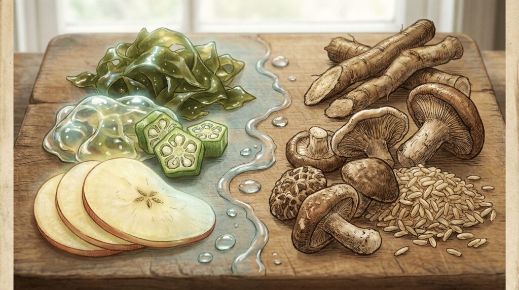 具体的な調整としては、海藻類(わかめ、めかぶ)、大麦、オクラ、りんごなど水溶性繊維を意識的に食事に加えるという選択肢があります。