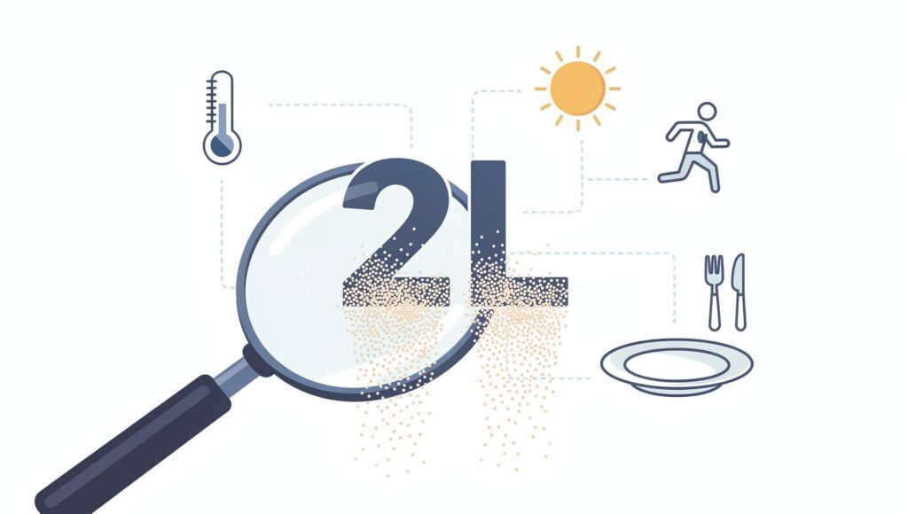 水分の必要量は、体格や年齢だけでなく、その日の活動量、気温、湿度、食事内容によっても変わります。