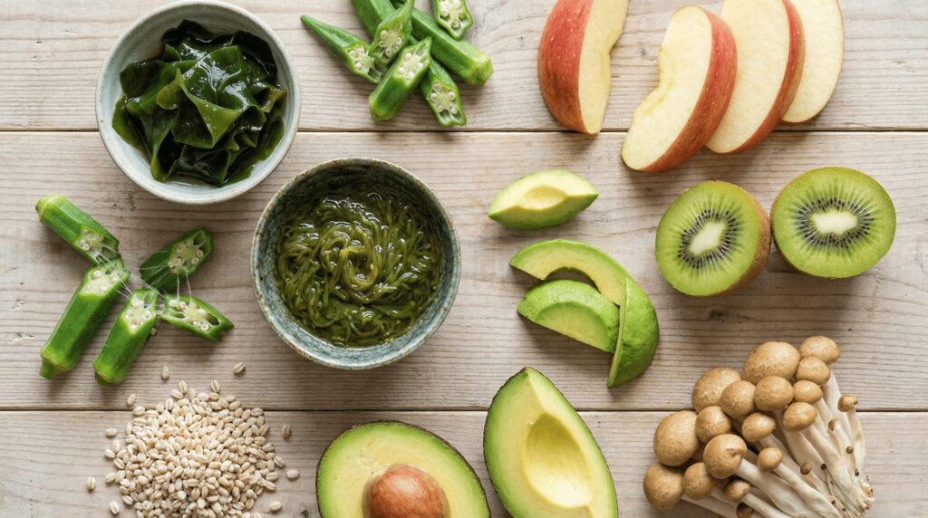 食事に取り入れやすい水溶性食品としては、海藻(わかめ、めかぶ)、大麦、オクラ、キウイフルーツあたりが手軽です。
