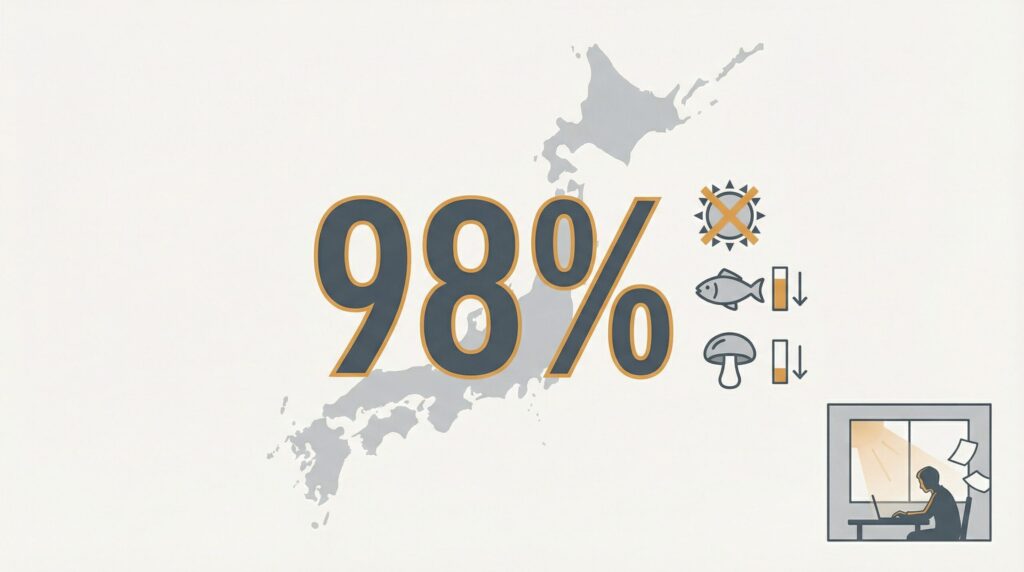 東京慈恵会医科大学が健康診断受診者5,518人を対象に行った調査(2019〜2020年)で、98%がビタミンD充足基準(血中25(OH)D濃度30ng/mL以上)に達していなかったという結果が出ています。