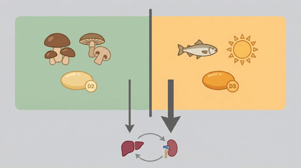 10件のランダム化比較試験(1,016名)を対象としたメタアナリシスによると、D3はD2と比較して血中25(OH)D濃度を有意に上昇させました(平均差15.23nmol/L)。D3のほうがビタミンD結合タンパク質(VDBP)との親和性が高く、肝臓での25-水酸化効率も優れています。