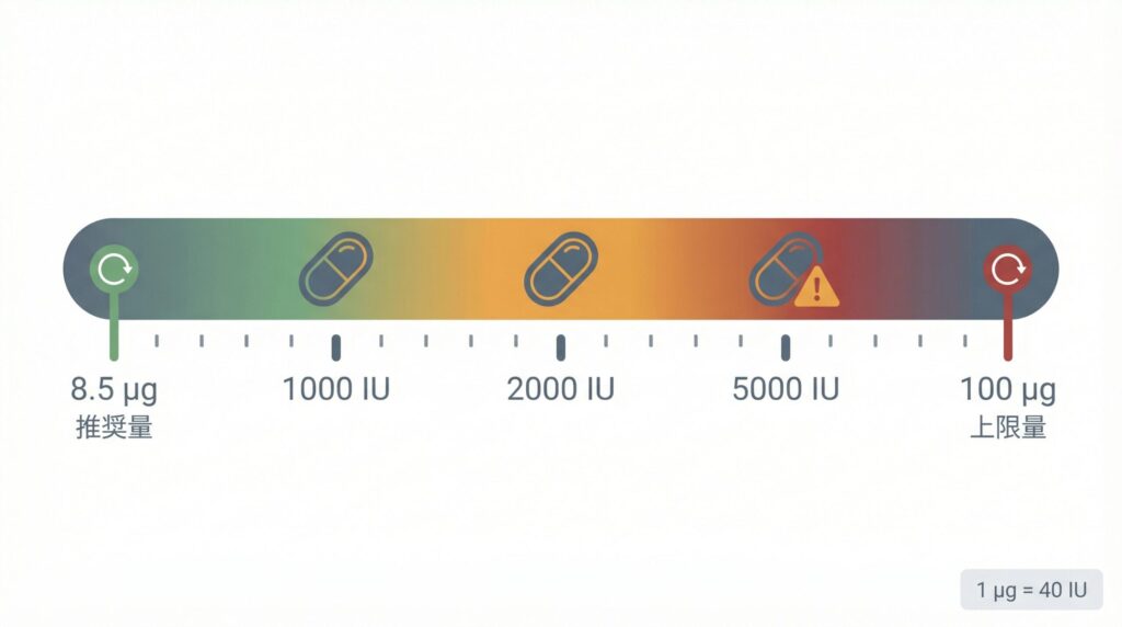 - 「足りない分を補う」量にする。日本の目安量は8.5μg/日(340IU)、上限は100μg/日(4,000IU)。1,000〜2,000IU程度が現実的な範囲です。5,000IUは上限を超える可能性があることを覚えておきましょう。
